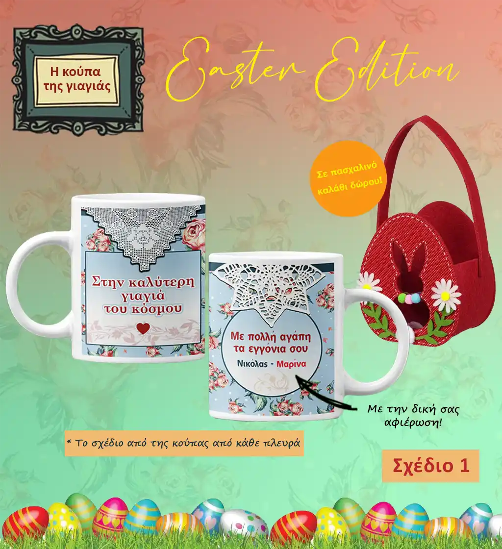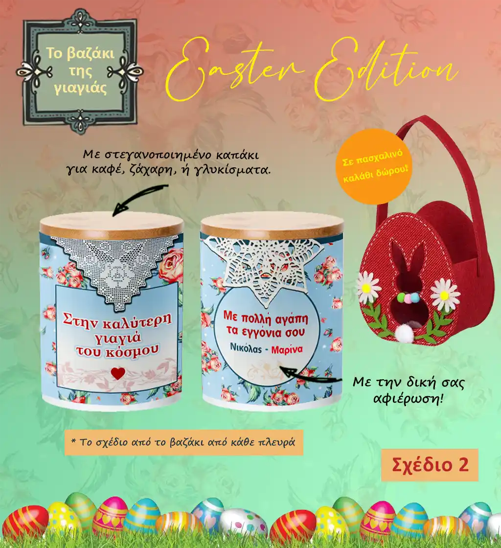 Πασχαλινή κούπα και βαζάκι για τη γιαγιά, ώστε να βάζει τον καφέ ή τη ζάχαρη, μαζί με αφιέρωση με τα ονόματα σας!