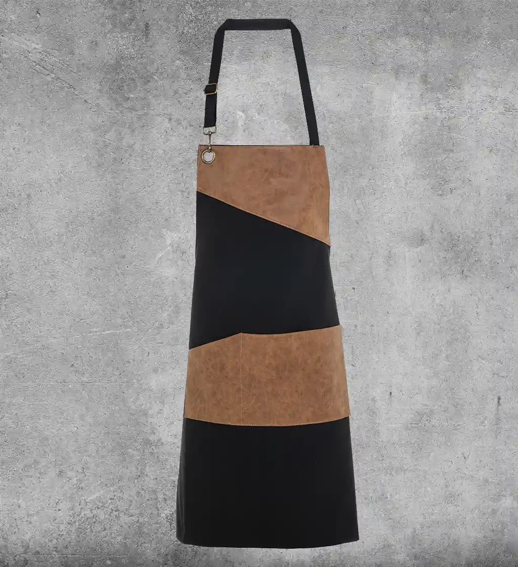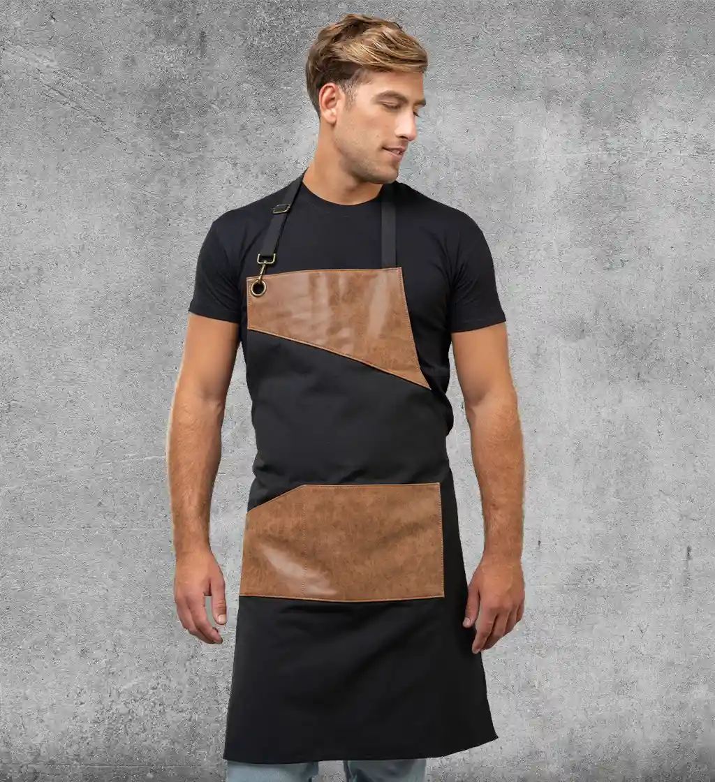 Ολόσωμη ποδιά εργασίας με διακοσμητικές λεπτομέρειες δερματίνης. Μακριά ως το γόνατο και μπροστινή τσέπη από δερματίνη. Unisex, κατάλληλη για μπαρ και εστιατόρια που θέλουν να ξεχωρίζει η εμφάνιση του προσωπικού τους!