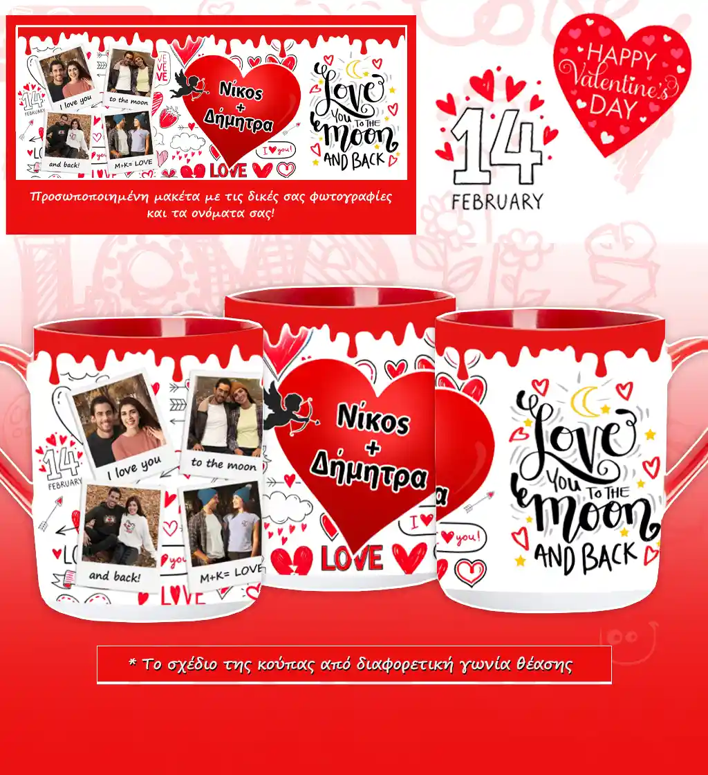 Φέτος ξεχωρίστε με την προσωποποιημένη Κούπα Αγίου Βαλεντίνου. Με επιλογές από δικές σας φωτογραφίες και με τα ονόματα να αναγράφονται σε μια φανταστική αγαπησιάρικη κούπα, που σίγουρα θα κερδίσει τις εντυπώσεις!
